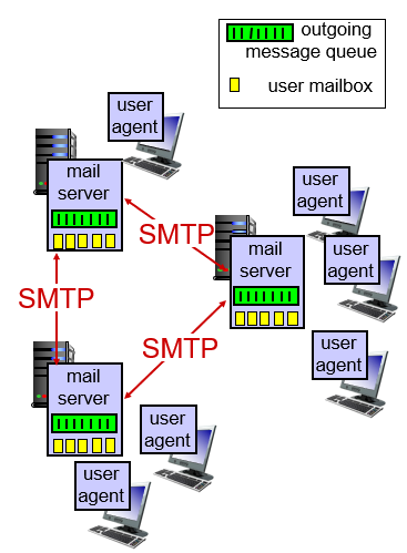 - 이메일에서 주요 컴포넌트 세가지 : user agents, mail servers, SMTP