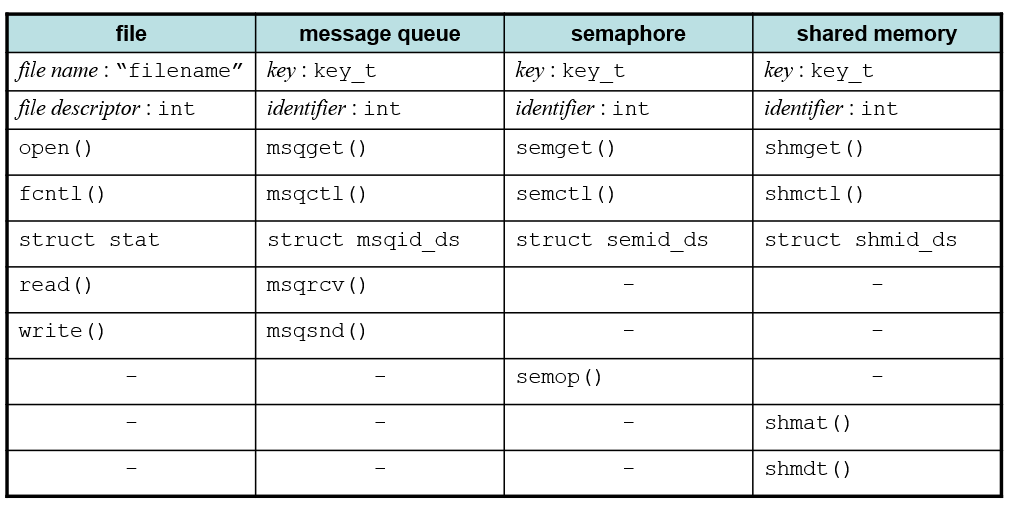 msg큐는 sys/msg.h 가 있고 sem은 뭐 암튼 이렇게 헤더 있음 msgget해서 리턴되는게 identifier임