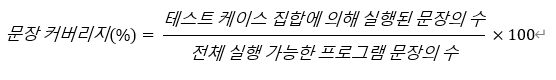 문장 커버리지 : 테스트 케이스 집합에 의해 문장 테스트가 어느정도로 이루어졌는지