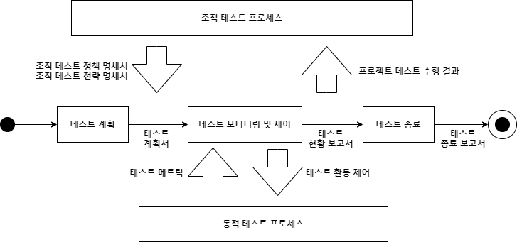 - 테스트 프로세스 : 조직에서 테스트를 수행할 때 준수할 테스트 프로세스를 명시
